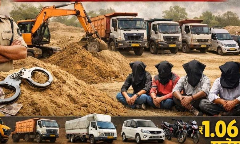 पोलीसांनी या कारवाई मध्ये 1 जेसीबी 16,50,000, 4 टिपर 60,00,000, 2 टेम्पो – 13,00,000, पांढ-या रंगाचे महिंद्रा कार 15,00,000, 4 दुचाकी वाहने 1,45,000, 3 ब्रास वाळू 12 हजार रुपये, 5 मोबाईल फोन किंंमत 73 हजार रुपये असा एकुण 1 कोटी 6 लाख 80 हजार रुपयांचा मुद्देमाल जप्त करण्यात आला आहे.
